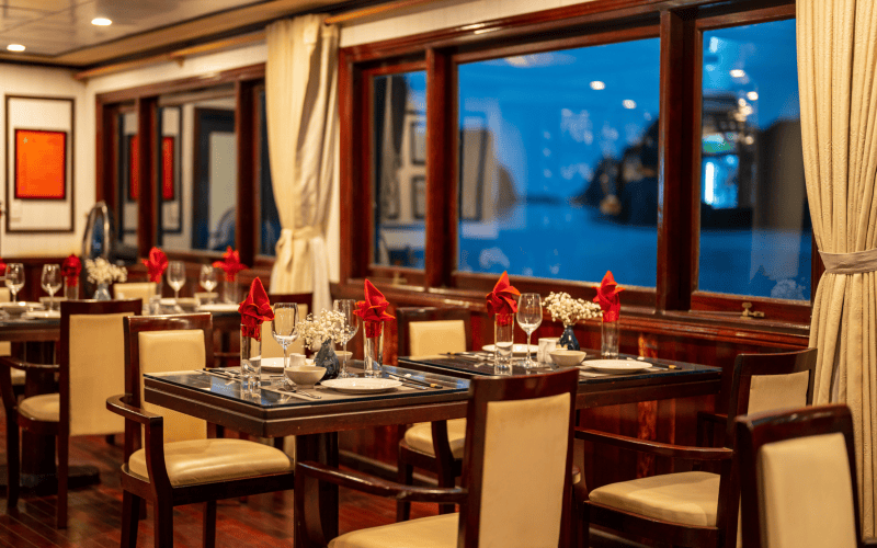 13.00: Bữa trưa với nhiều món hải sản được phục vụ tại nhà hàng khi tàu bắt đầu dời bến đi sâu vào vịnh bái tử long.