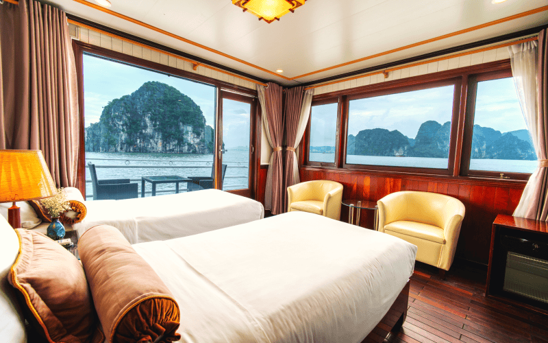 12.30: Chào mừng quý khách lên tàu, cùng thưởng thức đồ uống trong khi Quản lý tàu phổ biến những thông tin cần thiết. Làm thủ tục nhận phòng và nghỉ ngơi ít phút.