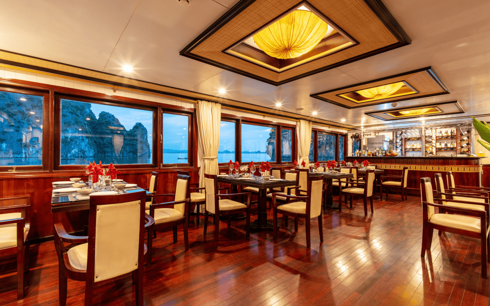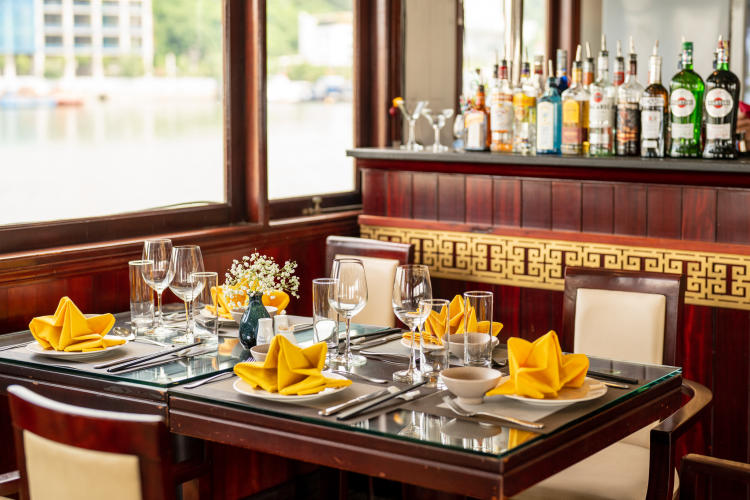 13.00: Bữa trưa với nhiều món hải sản được phục vụ tại nhà hàng khi tàu bắt đầu dời bến đi sâu vào vịnh bái tử long.